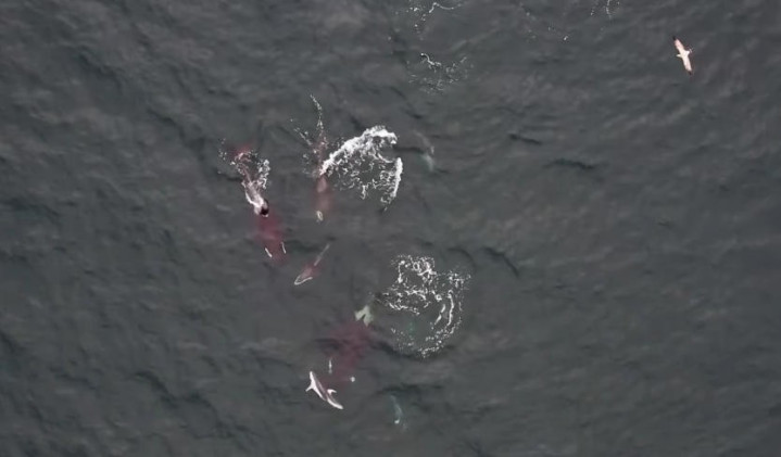 无论是无人机航拍还是水下的视频数据,都没显示虎鲸展现出任何攻击行为,例如拍打尾巴或者撕咬,这些都是虎鲸试图驱赶不速之客的方法。