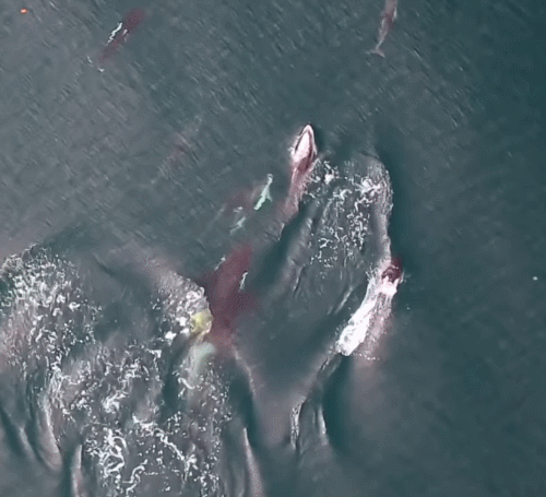 为了确认这两个种群间的关系,科学家们在这群虎鲸身上安装了吸盘式的追踪装置,上面配备了摄像头和声学记录仪,可以记录下水下的画面和声音。无人机也从上方跟拍两个种群的行动。